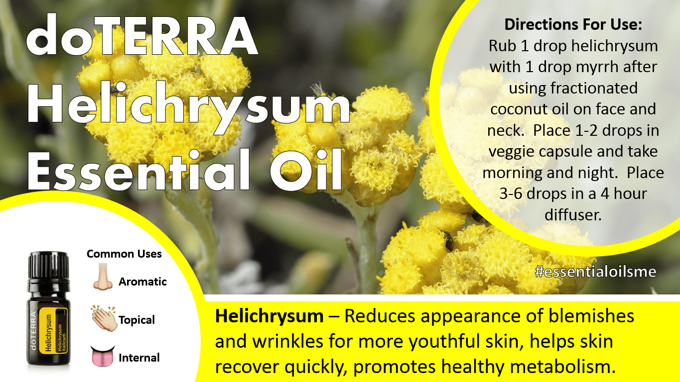 Helichrysum este renumit pentru proprietatile lui ce contribuie la un aspect tanar al pielii si al muschilor, ce sunt sprijin pentru o circulatie optima a sangelui si suport pentru procesul de regenerare al tesuturilor. Helichrysum ajuta la mentinerea unui nivel de colesterol optim la persoanele sanatoase, sustine raspunsul sanatos inflamatoriu din corp, ajuta la ameliorarea unor dureri minore ocazionale. Este un ulei esential excelent pentru sanatatea sistemului respirator si cel limfatic, pentru sanatatea ficatului, pancreasului, vezicii biliare si sistemului vascular. Diluat in ulei purtator, este utilizat in multe parti ale lumii ca fiind benefic pentru protejarea impotriva razelor solare.